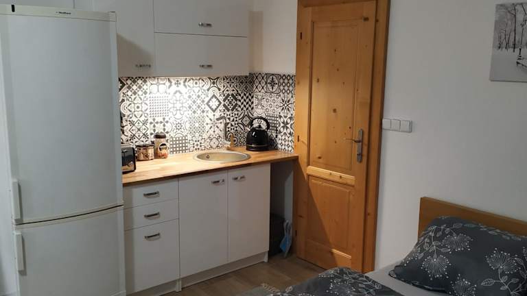 In der Unterkunft steht eine gut ausgestattete Küchenzeile zur Verfügung, die mit einem Kühlschrank, einer Mikrowelle und einer Herdplatte ausgestattet ist. Zudem ist die Essenslieferung in die Unterkunft möglich.