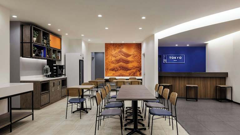 Der gastronomische Bereich umfasst ein Restaurant und ein Café, wo ein kontinentales Frühstück serviert wird. Snacks und Getränke können in der Bar oder an den Verkaufsautomaten bezogen werden.