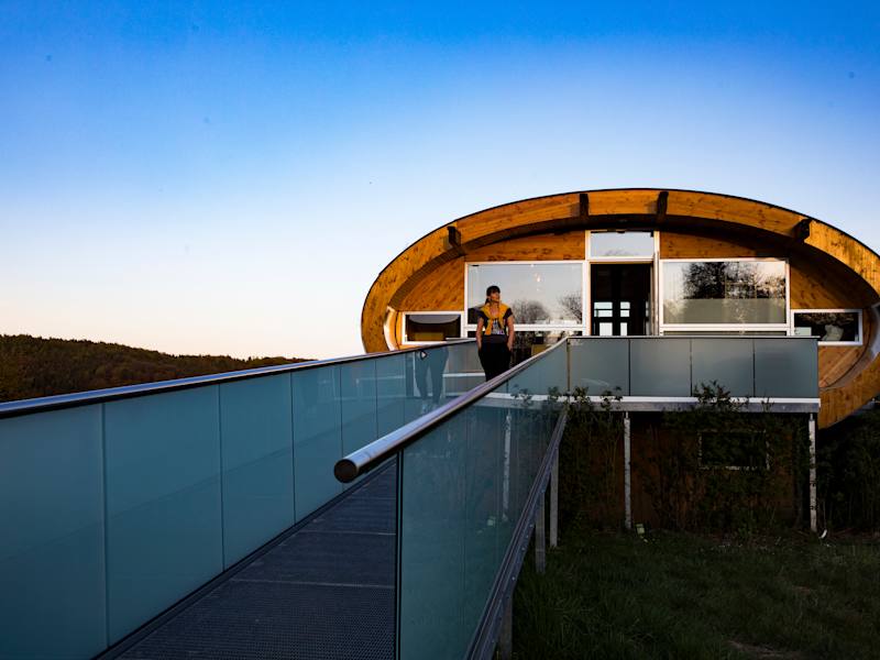 Urlaub dem Himmel so nah! Nach den Sternen greifen und die Seele fliegen lassen. Im ganz besonderen Holzhaus, kuschelig ausgebaut in seiner runden Form mit heimischen Naturmaterialien für gesundes Wohlfühlen und nachhaltig umweltfreundliches Wohnen. Drei Balkone und viel Glas versprechen Sonne oder Schatten und Nähe zur umgebenden Natur zu jeder Tageszeit. Eigene Infrarotliege im großzügigen Wellness-Bad. Der Schwimmteich lockt im Sommer mit seinem kühlen Nass und rund um Jahr als Biotop zum entspannten Beobachten von wichtigen und seltenen Insekten. Fränkisch-regionale Schlemmerkorbfüllung zur Begrüßung inklusive, Brötchenservice auf Wunsch täglich.