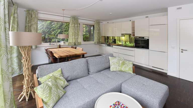 Die Ferienwohnung umfasst ein Schlafzimmer und ein Wohnzimmer. Sie verfügt über eine voll ausgestattete Küche mit Kühlschrank und Kaffeemaschine. Ein Badezimmer mit Dusche und Haartrockner ist ebenfalls vorhanden. Handtücher und Bettwäsche werden bereitgestellt.
