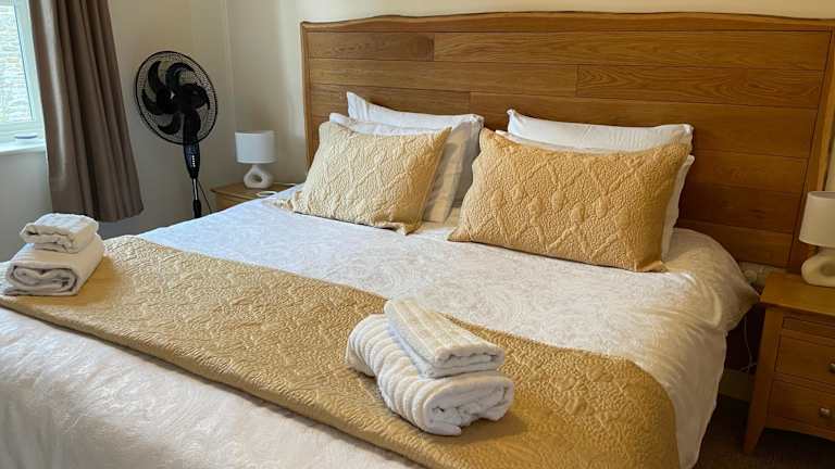 Das Ferienhaus verfügt über zwei Schlafzimmer und zwei Badezimmer, die mit Dusche und Badewanne ausgestattet sind. Die Küche ist unter anderem mit einem Kühlschrank, einem Geschirrspüler und einem Ofen eingerichtet. Das Wohnzimmer bietet einen Sitzbereich und einen Essbereich. Handtücher und Bettwäsche werden zur Verfügung gestellt.