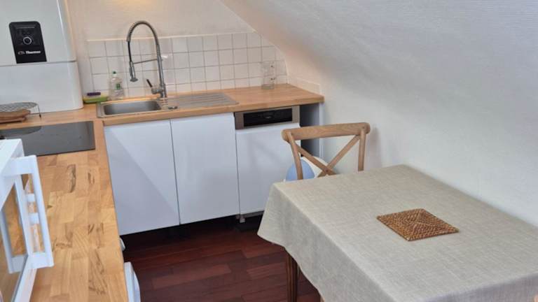 Die Ferienwohnung bietet eine helle und heimelige Atmosphäre mit einem Wohnzimmer, einem Essbereich, einem Schlafzimmer und einem Badezimmer mit Dusche. Zu den Annehmlichkeiten gehören ein DVD-Player, Handtücher und Bettwäsche.