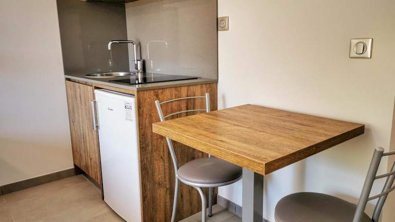 Die Wohneinheiten in Ustaria sind komfortabel eingerichtet und verfügen über ein eigenes Badezimmer mit Dusche. Die Ausstattung beinhaltet eine Klimaanlage, einen Flachbild-TV sowie einen Kühlschrank. In einigen Wohneinheiten ist zusätzlich eine Küche mit einem Ofen vorhanden.