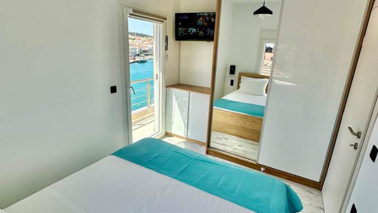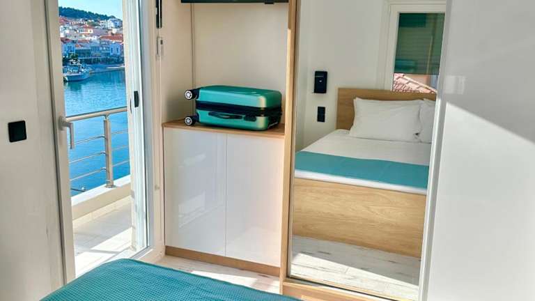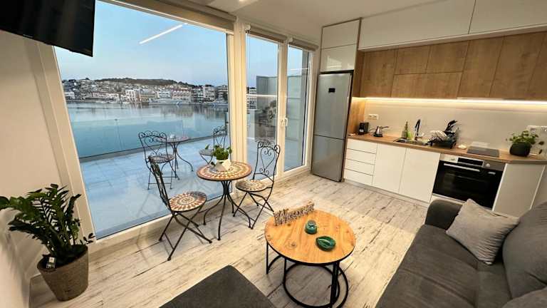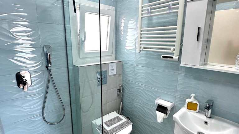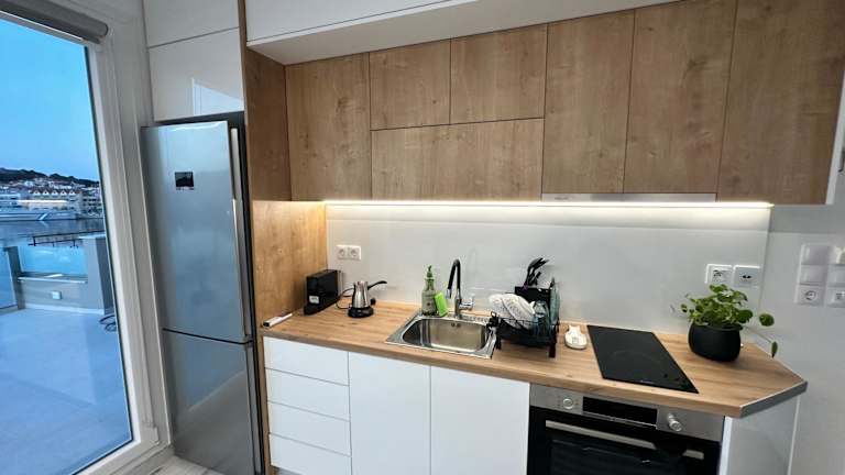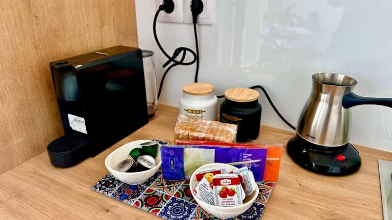 Die Ferienwohnung umfasst ein Schlafzimmer, ein Wohnzimmer sowie eine voll ausgestattete Küche mit Kühlschrank und Kaffeemaschine. Ein Badezimmer mit Bidet und Dusche ist ebenfalls vorhanden. Handtücher und Bettwäsche werden bereitgestellt.