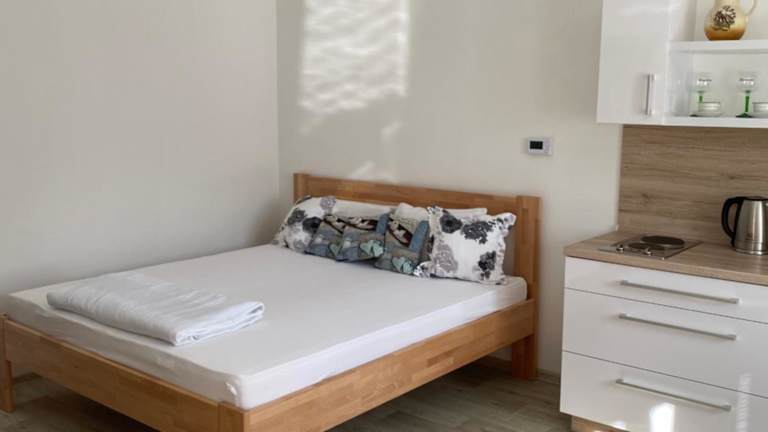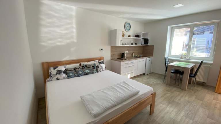 Die Unterkunft umfasst ein Schlafzimmer, eine Küche mit Kühlschrank und Mikrowelle sowie ein Badezimmer mit Dusche. Ein Flachbild-TV ist ebenfalls vorhanden.