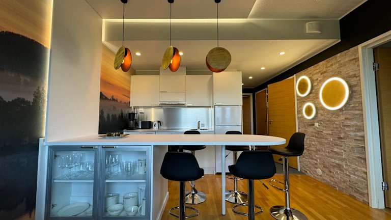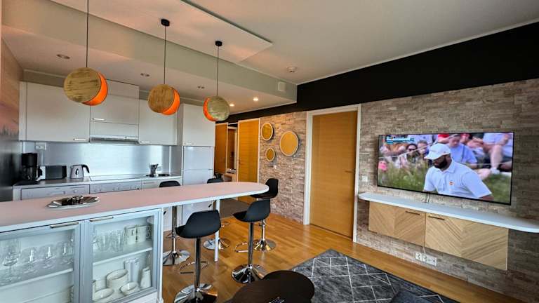 Die Unterkunft umfasst zwei Schlafzimmer und ist mit einem Flachbild-TV sowie einer voll ausgestatteten Küche versehen. Die Küche beinhaltet unter anderem einen Kühlschrank, Geschirrspüler, Waschmaschine, Ofen und Mikrowelle. Für zusätzlichen Komfort können Handtücher und Bettwäsche gegen Aufpreis zur Verfügung gestellt werden. Die Unterkunft verfügt zudem über schallisolierte Zimmer und eine Sauna.