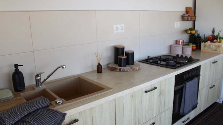 Das Ferienhaus besteht aus zwei Schlafzimmern und einem Wohnzimmer. Es verfügt über eine gut ausgestattete Küche mit Kühlschrank und Geschirrspüler. Zudem sind Handtücher und Bettwäsche vorhanden, und eine Terrasse ergänzt das Angebot.
