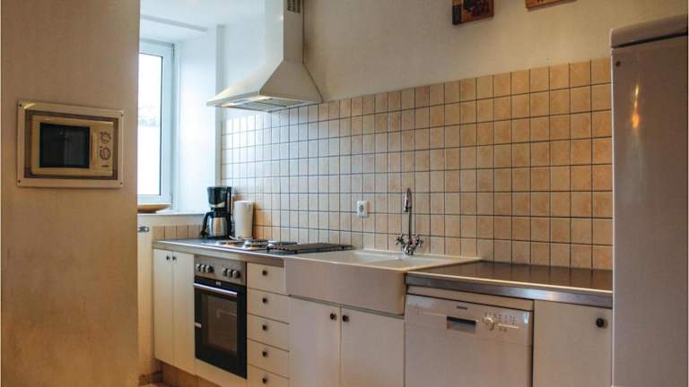 Die Ferienwohnung hat ein Wohnzimmer mit einem TV mit Kabelkanälen sowie eine voll ausgestattete Küche mit einem Kühlschrank und einem Geschirrspüler. Insgesamt gibt es zwei Badezimmer mit Dusche. Die Ausstattung sichert eine heimelige Atmosphäre während des Aufenthalts.