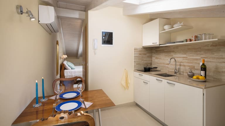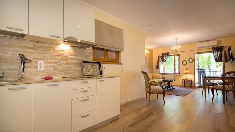 Die Wohneinheiten sind mit Parkettböden ausgestattet und verfügen über eine voll ausgestattete Küchenzeile, die einen Kühlschrank, Geschirrspüler, Mikrowelle, Herdplatte, Kaffeemaschine sowie Wasserkocher umfasst. Des Weiteren sind ein Essbereich, ein Flachbild-TV mit Satellitenkanälen und ein eigenes Badezimmer mit Dusche und Haartrockner vorhanden.