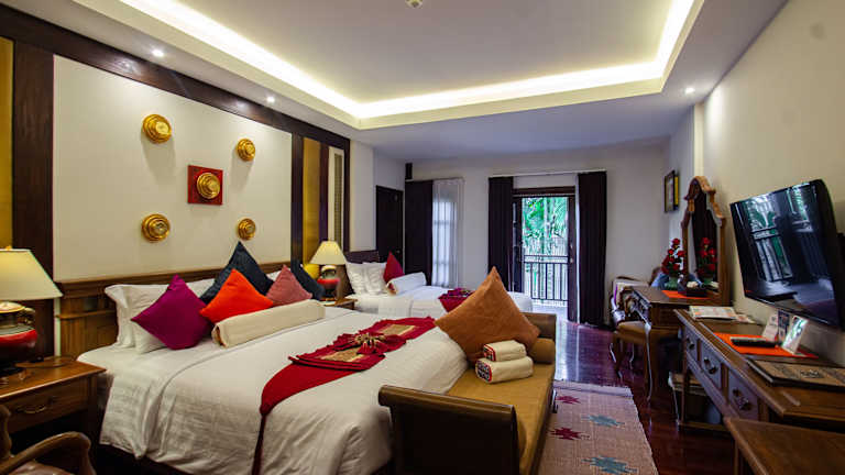 Die Zimmer im Viang Thapae Resort sind klimatisiert und bieten ein angenehmes Raumklima. Meistens gehört ein Balkon zur Ausstattung, der einen Blick auf den Garten oder Pool ermöglicht. Jedes Zimmer ist mit Teppichboden ausgelegt und mit einem Doppelbett oder Kingsize-Bett ausgestattet. Zu den weiteren Annehmlichkeiten zählen eine Minibar, ein Kühlschrank, eine Tee-/Kaffeemaschine und ein Fernseher mit Satellitenempfang. Zudem gibt es ein eigenes Bad mit Dusche und Badewanne, ausgestattet mit Bademänteln und Haartrocknern.