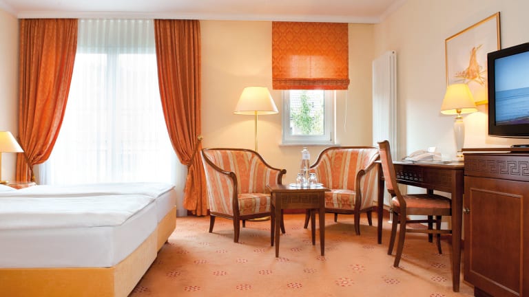 Kunst, Kultur, Komfort. Erfurt: Die Stadt, in der einst Luther studierte und Napoleon residierte. Unweit des mittelalterlichen Stadtkerns können auch Sie kaiserlich residieren – und zwar im Victor's Residenz-Hotel Erfurt. Hier erwarten Sie großzügige Zimmer und Suiten, erstklassiger Komfort und hervorragender Service. Hotelausstattung: Komfortable Zimmer und Suiten zur Einzel- und Doppelbelegung, mind. 28 qm groß, behindertengerechte Zimmer, teilweise Balkon oder Dachterrasse, gesicherte VIP-Etage, Restaurant, Victor's Stube, Bar, Terrasse, citynah, ruhige Innenstadtlage Besonderheiten: - kostenfreies Telefonieren in alle Fest- und Handynetze vom Zimmeranschluss - weltweit - im gesamten Hotel steht Ihnen kostenlos schnelles WLAN zur Verfügung - 8 Veranstaltungsräume (33 bis 485 qm, für 10 bis 400 Personen) mit Tageslicht und moderner Tagungstechnik - großes Konferenzfoyer - 56 Tiefgaragenparkplätze - 1 Busparkplatz am Hotel - ÖPNV Tickets erwerben Sie bequem an der Hotelrezeption Das Victor's Residenz-Hotel Erfurt ist mit dem GreenSign Nachhaltigkeitszertifikat ausgezeichnet.