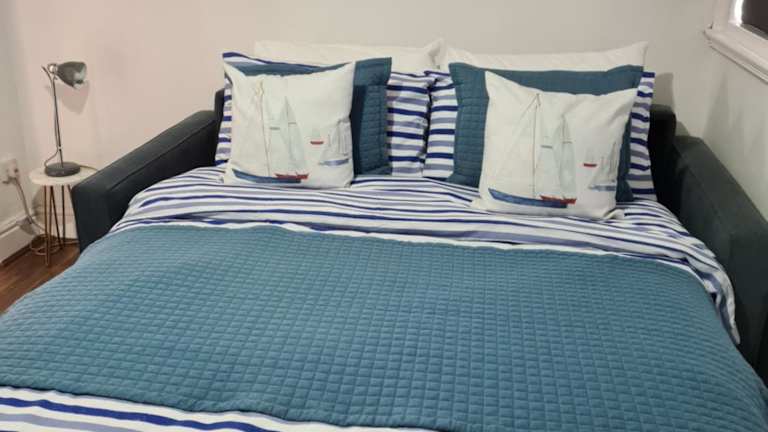Die Ferienwohnung umfasst drei Schlafzimmer und ein Wohnzimmer sowie eine voll ausgestattete Küche mit Kühlschrank und Kaffeemaschine. Ein Badezimmer mit Dusche und Badewanne ist ebenfalls vorhanden. Handtücher und Bettwäsche werden bereitgestellt.