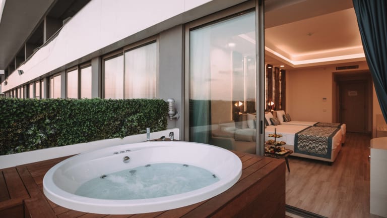 Liebe Gaeste, in allen Zimmern ist der Safe gegen einen Aufpreis. Sämtliche Zimmer verfügen über einen Balkon, Parkettboden, einer elektronischen Türkarte, Sofa und Sessel, Minibar, Wasserkocher, Tee/Kaffee Setups, nationales und internationales Satelliten-TV mit Tee- und Kaffeekocher, Direktwahltelefon, speziellen Toilettenartikel, Haartrockner, WC, Dusche , Bad-Telefon, zentrale Klimaanlage (wetterabhängig, stündlich), elektronischen Safe. Die Zimmerreinigung sowie der Wechsel von Handtüchern erfolgt täglich und der Wäschewechsel alle drei Tage. Bademäntel sind auf Anfrage gegen Gebühren erhältlich. Auf Wunsch kann ein Babybett im Zimmer platziert werden. Alle Zimmer sind Nichtraucherzimmer. Standardzimmer: Diese sind mit einer Größe von 28-32 m² modern eingerichtet. Die Mindestkapazität beträgt 2 und die maximale Kapazität 2+1 oder 3 Personen. Economy-Zimmer: Diese sind mit einer Größe von 28 m² modern eingerichtet. Sie befindet sich im Gartengeschoss und bieten Garten- sowie Poolblick. Die Mindestkapazität beträgt 2 und die maximale Kapazität 2+1 oder 3 Personen Standard behinderten-gerechte Zimmer: Unsere behindertengerechten Zimmer haben eine Größe von 32 m2 und sind für Übernachtungen von mindestens 1 sowie maximal 2+1 Personen geeignet. Terrassen Luxury Zimmer: Unsere Zimmer mit einem Nutzungsbereich von 43m² haben eine Größe von 28 m² und besitzen eine 15m² große Terrasse und sind modern eingerichtet. In diesen Zimmern befinden sich Espresso-/Kaffeemaschinen mit speziellen Kapseln. Die Mindestkapazität beträgt 2 und die maximale Kapazität 2+1 oder 3 Personen Terrassen Premium Zimmer: Unsere Zimmer mit einem Nutzungsbereich von 43m² haben eine Größe von 28 m² und besitzen eine 15m² große Terrasse, sind modern eingerichtet und haben einen Whirlpool auf der Terrasse. In diesen Zimmern befinden sich Espresso-/Kaffeemaschinen mit speziellen Kapseln. Es steht Ihnen in diesen Zimmern auch ein kostenfreier Bademantelservice zur Verfügung. Die Mindestkapazität beträgt 2 und die maximale Kapazität 2+1 oder 3 Personen Standard Deluxe Zimmer: Diese Zimmer mit einer Wohnfläche von 42 m² sind modern ausgestattet. Es befinden sich sowohl im Schlaf- als auch im Wohnbereich insgesamt 2 Fernseher. In diesen Zimmern befinden sich Espresso-/Kaffeemaschinen mit speziellen Kapseln. Die Mindestkapazität beträgt 2 und die maximale Kapazität 2+1 oder 3 Personen. Superior Familienzimmer: Das Superior Familienzimmer hat eine Größe von 42m² und bestehen aus 2 Schlafzimmern. Das Elternschlafzimmer hat ein französisches Bett, das zweite Schlafzimmer ein Twin Bett und es ist eine Verbindungstür vorhanden. Die wichtigste Eigenschaft dieses Zimmers ist die Dusch- und WC-Ausstattung: Es sind 2 Bäder vorhanden. Mit dieser Eigenschaft wird der Zeitverlust reduziert und die Familien haben mehr Zeit für Spaß im Urlaub. Die Mindestkapazität beträgt 2+1 und die maximale Kapazität 4+1 Personen. Familienzimmer: Dieses hat eine Größe von 35 m² und besteht aus 2 Schlafzimmern. Das Elternschlafzimmer hat ein französisches Bett, das zweite Schlafzimmer ein Twin Bett und es ist eine Verbindungstür vorhanden. Es ist ein Bad mit Dusche und WC vorhanden. Die Mindestkapazität beträgt 2+1 und die maximale Kapazität 4 Personen King Suite: Die King Suite besitzt mit einem 90 m² großen Schlafzimmer und einem Wohnzimmer sowie einer 50 m² großen Terrasse eine Gesamtnutzfläche von 140 m². Das Hauptschlafzimmer hat ein französisches Bett sowie ein Bad mit Duschkabine; das zweite Zimmer hingegen besteht aus einem luxurösen Wohnzimmer sowie einer Küche. In diesen Zimmern befinden sich Espresso-/Kaffeemaschinen mit speziellen Kapseln. Auch steht Ihnen in diesen Zimmern ein kostenfreier Bademantelservice zur Verfügung. Die Minimumkapazität beträgt 2+2 und die maximale Kapazität 4 Personen. Flitterwochenkonzept: Für unser Flitterwochengäste bieten wir eine spezielle Raumdekoration Bademäntel und Hotelslipper, eine reiche Auswahl an Annehmlichkeiten-Artikeln, Frühstück auf das Zimmer am ersten Tag sowie eine symbolische Torte in Herzform beim Check-in Geburtstagskonzept: Unseren Geburtstagsgästen wird bei Mitteilung an die Rezeption eine kostenfreie Geburtstagstorte und Wein zum Abendessen oder auf das Zimmer serviert. Hochzeitstag-Konzept: Für unsere Gäste, die Ihren Hochzeitstag bei uns verbringen, servieren wir eine Torte in Herzform sowie Wein.