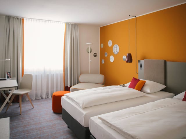 Frisches Blau, lebendiges Orange und spritziges Gelb-Grün: so erstrahlen die neuen Easy Zimmer. Kombiniert mit lässigen Möbeln, lokalen Dekorationselementen und kuschlig, bequemen Boxspringbetten sind die Zimmer perfekt für Ihren nächsten Aufenthalt. Kostenfreies Highspeed WLAN, digitale Zeitungen und eine Flasche Wasser runden das Angebot ab.