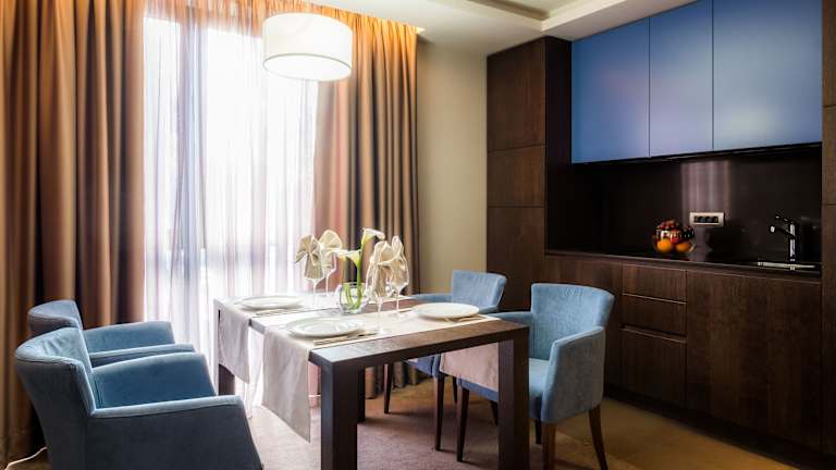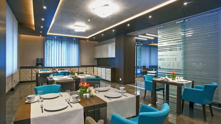 Die gastronomischen Einrichtungen umfassen ein Café und eine Bar. Täglich wird ein nahrhaftes Frühstück in Form eines kontinentalen Buffets serviert. Auf Wunsch werden auch Diätgerichte und Kindermenüs zubereitet.