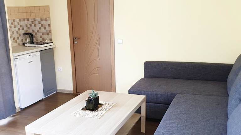 Die Wohneinheiten verfügen über eine Küchenzeile mit Kühlschrank, Herdplatte und Wasserkocher, was die Selbstverpflegung ermöglicht.