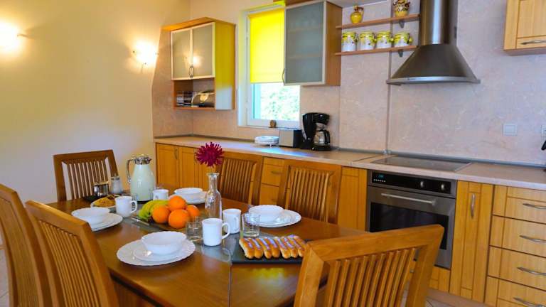 Die Villa umfasst 3 Schlafzimmer, ein Wohnzimmer, eine voll ausgestattete Küche mit Kühlschrank und Kaffeemaschine sowie 2 Badezimmer, jedes ausgestattet mit Dusche und Haartrockner. Handtücher und Bettwäsche werden bereitgestellt. Die Villa bietet auch eine Gemeinschaftsküche und einen grösseren Wohnbereich für zusätzliche Bequemlichkeit.