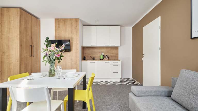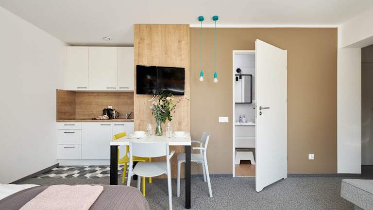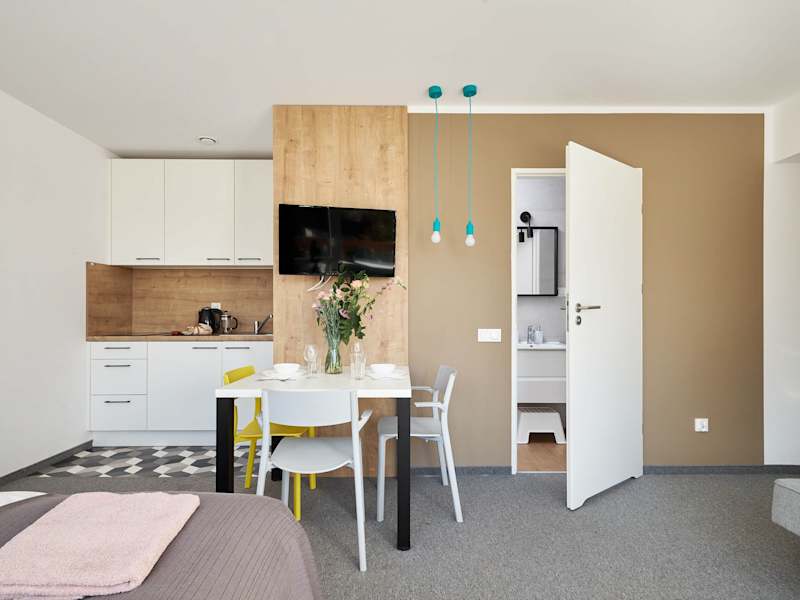 Jede Wohneinheit ist mit einer voll ausgestatteten Küche, einem Esstisch, einem Flachbild-TV sowie einem privaten Badezimmer mit Dusche und Haartrockner ausgestattet. Kühlschrank, Herdplatte und Wasserkocher sind ebenfalls vorhanden.