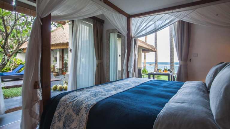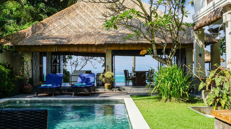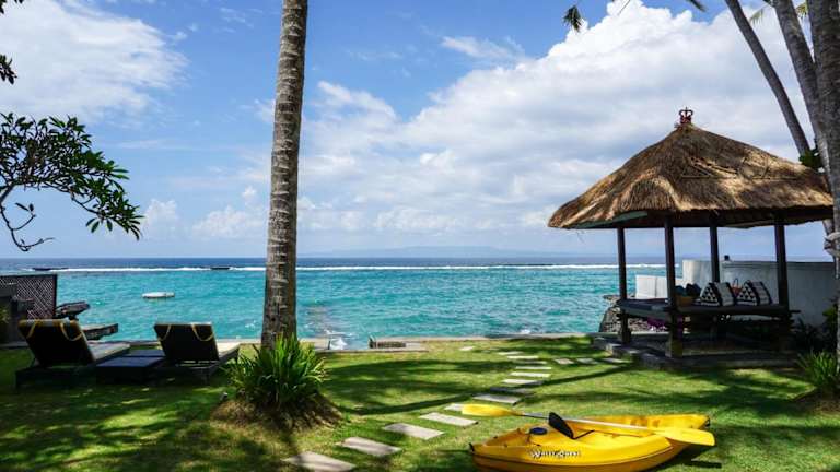 Die Villa Anjani - Oceanfront Villa, With Private Garden and Cook - Candidasa liegt 5 Fahrminuten vom Zentrum von Candidasa entfernt, direkt an einem kleinen weissen Sandstrand. Die Mendira Beach Bars und Restaurants sind ebenfalls nur 5 Fahrminuten entfernt. Der internationale Flughafen Denpasar ist in 1,5 Stunden erreichbar.