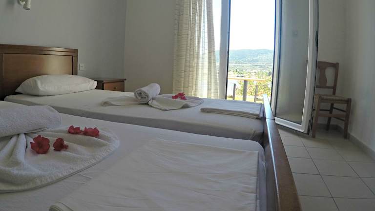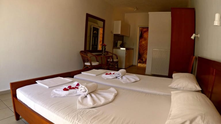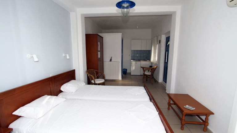 Die Zimmer sind mit einem Doppelbett, einer Kochnische mit Kühlschrank, einem Badezimmer mit Dusche und Badewanne sowie Balkon oder Terrasse ausgestattet. Zur technischen Ausstattung gehören ein Fernseher, ein Telefon und kostenloses WLAN. Eine Klimaanlage ist gegen Gebühr verfügbar. Für Familien stehen spezielle Familienzimmer zur Verfügung.