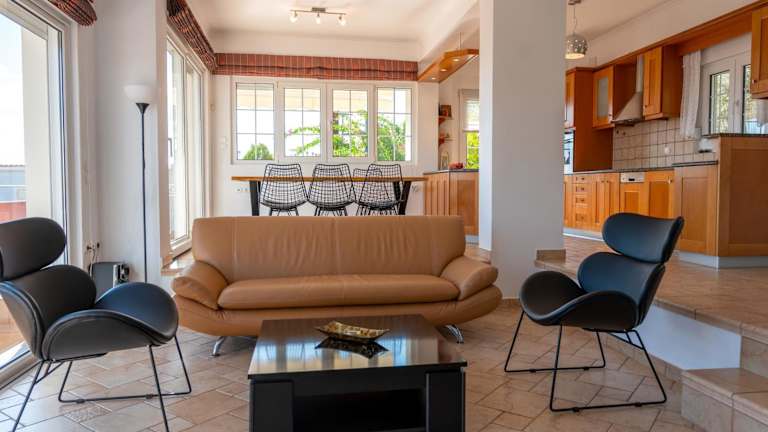 Die Villa umfasst 4 Schlafzimmer, ein Wohnzimmer sowie eine voll ausgestattete Küche mit Kühlschrank und Kaffeemaschine. Insgesamt gibt es 3 Badezimmer, ausgestattet mit Dusche und Haartrockner. Handtücher und Bettwäsche werden bereitgestellt.