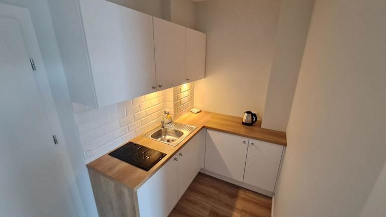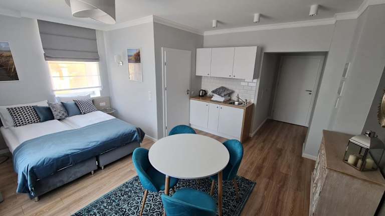 Jede Wohneinheit ist mit einer voll ausgestatteten Küchenzeile eingerichtet, die eine Herdplatte, eine Kaffeemaschine und einen Esstisch umfasst. Dies ermöglicht den Gästen, ihre eigenen Mahlzeiten zuzubereiten.