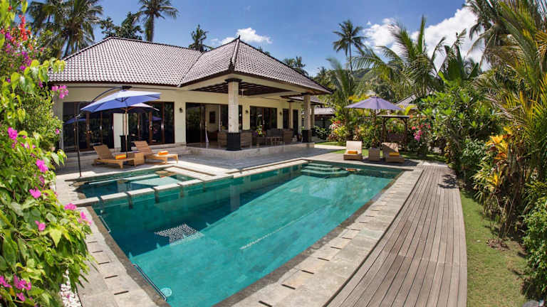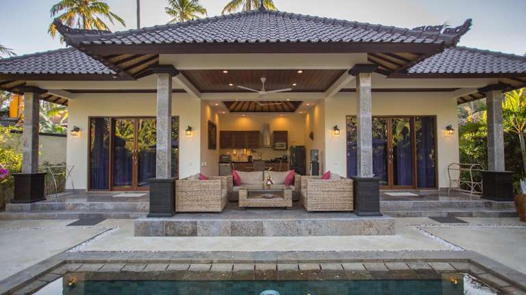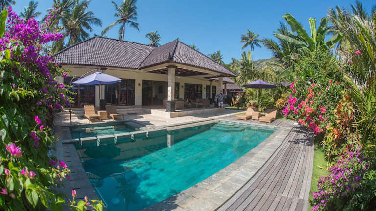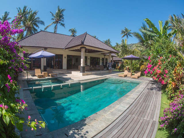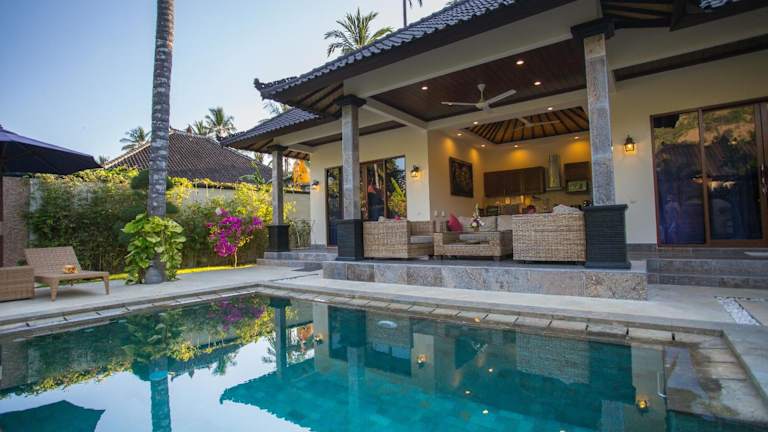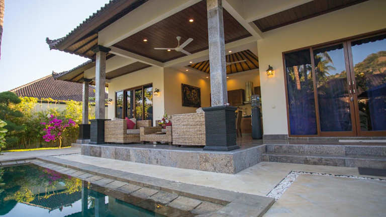 Die Villa Barong befindet sich nur 5 Gehminuten vom Strand von Candidasa entfernt. Die Umgebung ist geprägt von Landschaftsgärten und Kokospalmen. In der Nähe liegt der Wasserpalast Tirta Gangga, der nach 30 Fahrminuten erreichbar ist, sowie der internationale Flughafen Denpasar, der nach 90 Fahrminuten zu erreichen ist.