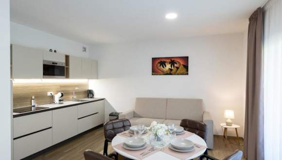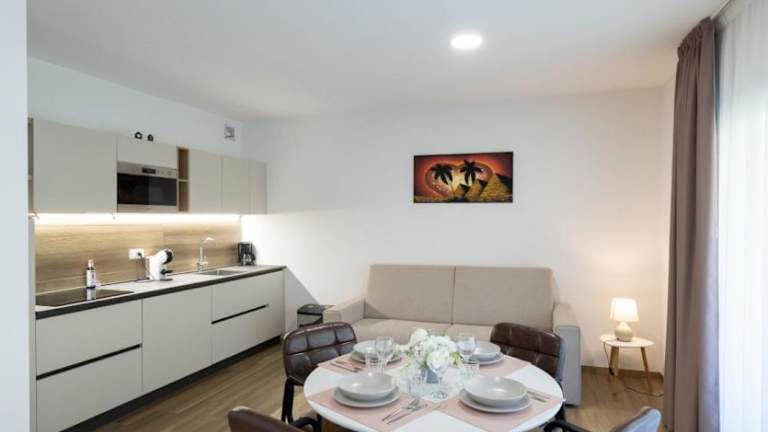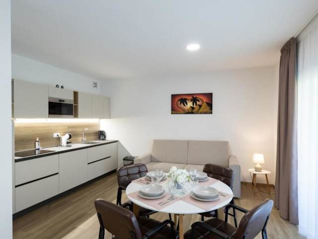 Jede Wohneinheit ist mit einer gut ausgestatteten Küche eingerichtet, die einen Kühlschrank, einen Ofen, eine Mikrowelle sowie eine Kaffeemaschine umfasst. Es gibt auch einen Essbereich in den Apartments.