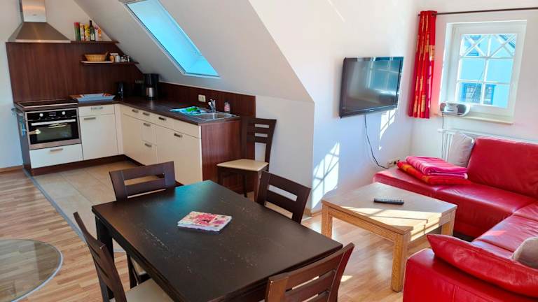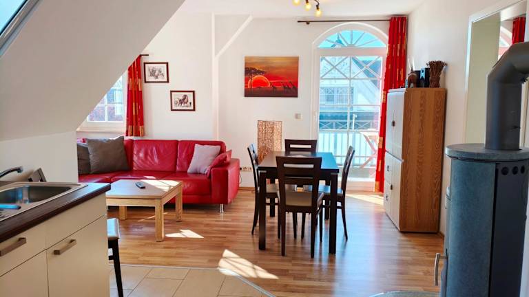Die Ferienwohnung Villa Carpe Diem Wohnung 9 bietet eine attraktive Unterkunft mit einem Balkon und kostenlosen Parkiermöglichkeiten. Die Wohnfläche ist modern eingerichtet und bietet Platz für Familien oder Gruppen bis zu vier Personen. Es sind keine Junggesellen-/Junggesellinnenabschiede oder ähnliche Feiern erlaubt, und es handelt sich um eine Nichtraucherunterkunft.