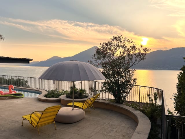 Die exklusive VILLA CELESTE liegt am Fuße des Monte Baldo nahe des malerischen Fischerdorfs Castelletto di Brenzone am Gardasee. Hier genießen Sie den einzigartigen Weitblick auf das tiefblaue Wasser des Sees und die Berge, die spektakulären Sonnenuntergänge, den direkt über dem See gelegenen Pool, die Sonnenterrasse mit Essbereich und die Nähe zum Strand VILLA CELESTE bietet ausreichend Platz für 8(10) Personen: Großzügiger Wohnbereich, zwei Küchen, vier komfortable Schlafzimmer und drei Bäder. VILLA CELESTE befindet sich in einer strategischen Lage- ideal um die Umgebung mit etlichen Städtchen entlang der Westküste des Gardasees zu erkunden, sich in der Natur zu entspannen und Sport zu treiben. Ein kurzer Fußweg führt zum nur 600 m entfernten Strand. Direkt am See entlang verläuft ein neu errichteter Spazier- und Radweg, der bis in das nahe gelegene Fischerdorf Castelletto führt. Castelletto ist ein zauberhafter Ort mit malerischen, bunten Häusern, engen Gässchen, Türmen, Stadtmauer und einem kleinen Hafen, sowie mehreren Restaurants. In Castelletto befindet sich auch eine Haltestelle für Linienboote, mit denen man zum anderen Seeufer fahren kann, um weitere Sehenswürdigkeiten zu besichtigen. Wer die Gegend auf eigene Faust erkunden möchte, hat die Möglichkeit sich in Castelletto ein Boot oder einen Roller zu mieten und sich auf eine Entdeckungsfahrt zu begeben. In der Nähe der VILLA CELESTE verlaufen zudem mehrere Wanderwege. Weitere sportliche Aktivitäten in der Umgeung: Radtouren, Kite-Surfing, Windsurfing, Rafting und Kanutouren. Wenige Kilometer in südlicher Richtung liegen Torri del Benaco, Garda und Bardolino, in nördlicher Richtung gelangt man nach Malcesine und Riva del Garda. Die Unterkunft VILLA CELESTE ist von einem wunderschönen Garten umgeben und mit einem privaten Pool ausgestattet. Die Villa erstreckt sich über drei Ebenen. Auf allen Ebenen und aus allen Zimmern genießen Sie einen atemberaubenden Panoramablick und absolute Privatsphäre. In Richtung Süden reicht der Blick bis Sirmione und im Norden bis Riva del Garda. Der Haupteingang liegt auf der ersten Ebene und führt in den großzügigen Wohnbereich, der mit einem bequemen Sofa und Kamin ausgestattet ist. Von den französischen Fenstern bietet sich ein herrlicher Ausblick auf den See. Ein rundumlaufender Balkon bietet Platz zum Verweilen - hier kann man bei einem Aperitif den Sonnenuntergang über dem See genießen. Ebenfalls auf der ersten Ebene befinden sich eine geräumige Küche mit Bar, ein Esstisch für 10 Personen, ein Bad, sowie Waschmaschine und Trockner. Eine Treppe führt hinunter auf die zweite Ebene zum Schlafbereich, wo man von jedem Zimmer den Seeblick hat. Diese Ebene besteht aus vier großen Schlafzimmern, die wie folgt aufgeteilt sind: Ein Schlafzimmer mit Kingsize-Bett und eigenem Badezimmer, zwei Schlafzimmer mit Kingsize-Bett und einem gemeinsamen Badezimmer, sowie ein Schlafzimmer mit Kingsize-Bett, einem Etagenbett und eigenem Badezimmer. Der gesamte Schlafbereich bietet maximalen Komfort und Privatsphäre für 10 Gäste. Nur wenige Treppenstufen tiefer liegt die dritte Ebene mit dem „Freizeitbereich“ der Villa. Hier befindet der romantische Garten, sowie der 14 m lange direkt über dem See gelegene Swimmingpool mit Sonnenterrasse und einer Sommerküche mit Essbereich für 10 Personen, großem Grill, Tischtennisplatte und allem, was man für sorglose Momente der Entspannung mit Freunden oder Familie in einem exklusiven Ambiente braucht. Wir sind gerne bei der Buchung von Restaurants oder Transfers behilflich. Auf Nachfrage (nach Verfügbarkeit) können gegen einen Aufpreis folgende Services gebucht werden: - Koch - Erstausstattung des Kühlschrankes nach Wünschen des Gastes - E-bikes mit Anlieferung zum Haus - Massage - zusätzliche Reinigung während des Aufenthalts Es steht ein Wifi-Anschluss und ein Autostellplatz zur Verfügung. Bitte beachten Sie, dass der Pool und die Sommerküche vom 1. November - 31. März geschlossen ist. Die Gäste werden gebeten, sowohl die Mittagsruhe als auch die Ruhezeit zwischen 22.00 Uhr und 9.00 Uhr einzuhalten. Das Abhalten von Festen oder Events ist nicht zulässig. Die Tourismussteuer, sowie die Reinigungsgebühr sind im Preis enthalten.