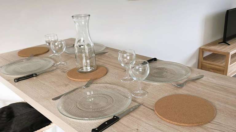 Eine voll ausgestattete Küchenzeile mit Kühlschrank und Geschirrspüler ermöglicht die Zubereitung eigener Mahlzeiten. Es sind keine zusätzlichen Informationen zu Verpflegungsmöglichkeiten vorhanden.