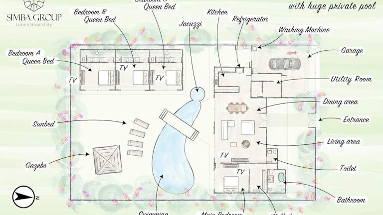Die Villa umfasst 4 Schlafzimmer, ein Wohnzimmer und eine gut ausgestattete Küche. In jedem der 4 Badezimmer stehen ein Bidet und eine Dusche zur Verfügung. Die Einrichtung ist heimelig und bietet einen direkten Blick auf den eigenen Pool.