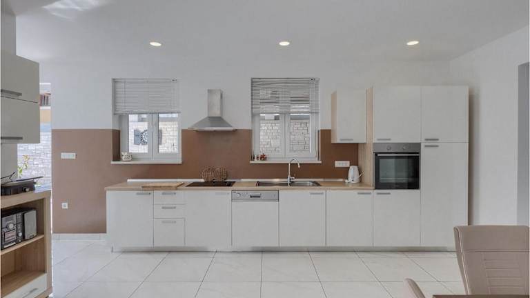 In der voll ausgestatteten Küche der Villa finden Gäste alles, was sie benötigen, um ihre eigenen Mahlzeiten zuzubereiten. Die Küche ist ausgestattet mit einem Kühlschrank, Geschirrspüler, Ofen und einer Kaffeemaschine.