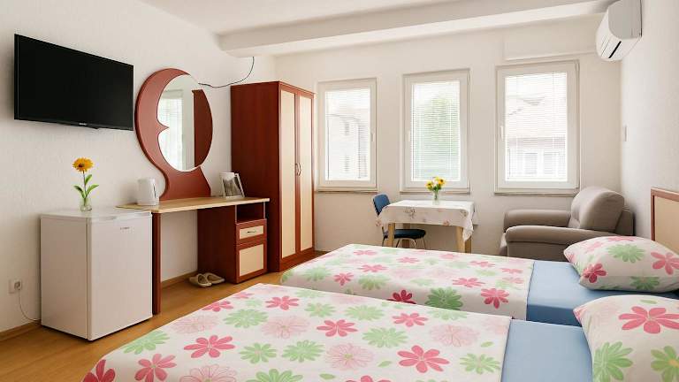In der Unterkunft Villa Emilija sind die Zimmer mit einer Klimaanlage, einem Flachbild-TV und einem Kühlschrank ausgestattet. Jedes Zimmer hat ein eigenes Badezimmer mit Dusche und Haartrockner. Bestimmte Zimmer bieten zudem einen Balkon. Die Zimmer sind ideal für Gäste, die auch während ihres Aufenthalts eine heimelige Atmosphäre schätzen. Ein Schreibtisch ist ebenfalls in jedem Zimmer vorhanden.