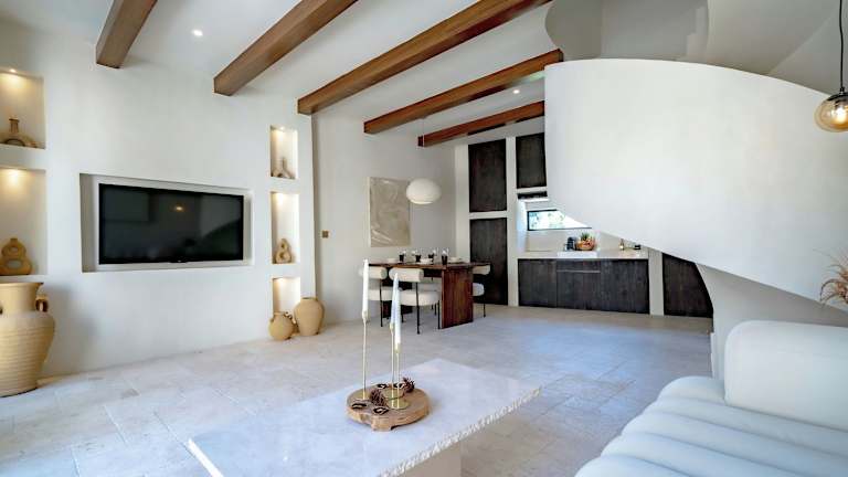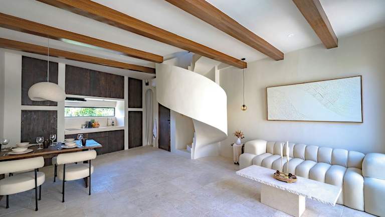 Die Villa bietet ein Schlafzimmer und ein Badezimmer, ausgestattet mit Bettwäsche und Handtüchern. Zur weiteren Ausstattung gehören ein Flachbild-TV, ein Essbereich und eine voll ausgestattete Küche. Ein Terrasse mit Blick auf den Pool rundet das Angebot ab.