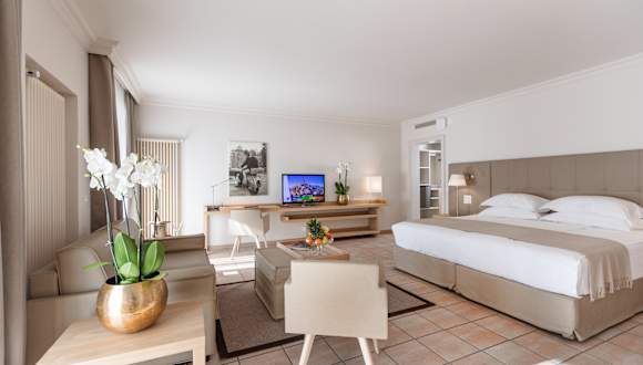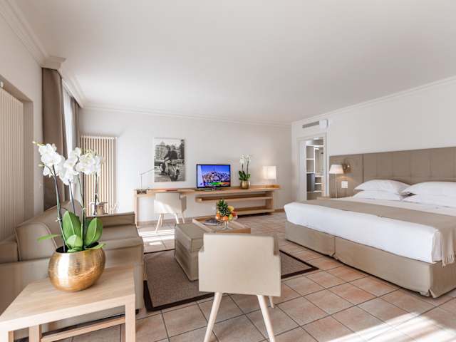 Die neu rennovierten, geräumigen und komfortablen Zimmer im klassischen mediterranen Stil renoviert, sind alle ausgestattet mit Klimaanlage, Minibar, WLAN, Safe, Radio, TV LCD, Badzimmer aus Marmor, Föhn, Bademantel, Pantoffeln und Pflegeprodukten. Alle verfügen über einen Balkon oder eine Terrasse mit Blick auf den Park.