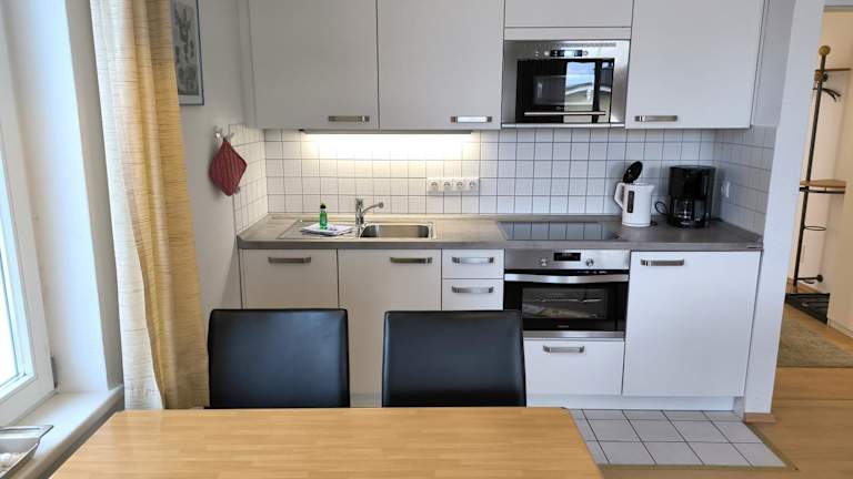 Die Ferienwohnung verfügt über zwei Schlafzimmer, ein Badezimmer mit Dusche, einen Fernseher und eine gut ausgestattete Küche, die mit einem Kühlschrank und einem Geschirrspüler ausgestattet ist.