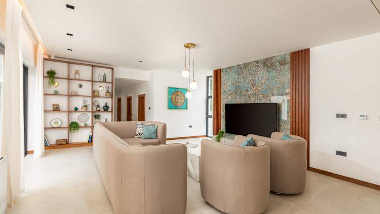 Hochwertige Ausstattung und Komfort Die Villa verfügt über fünf stilvoll eingerichtete Schlafzimmer, jedes mit eigenem Flachbildfernseher. Kostenloses WLAN, ein großer Satelliten-TV im Wohnzimmer und eine voll ausgestattete Küche – inklusive Geschirrspüler, Backofen, Mikrowelle und Kaffeemaschine – sorgen für modernen Komfort. Darüber hinaus stehen eine Waschmaschine und ein Wäschetrockner zur Verfügung. Die Villa ist komplett klimatisiert, allergikerfreundlich und rauchfrei. Somit ist sie ideal für Familien und längere Aufenthalte.