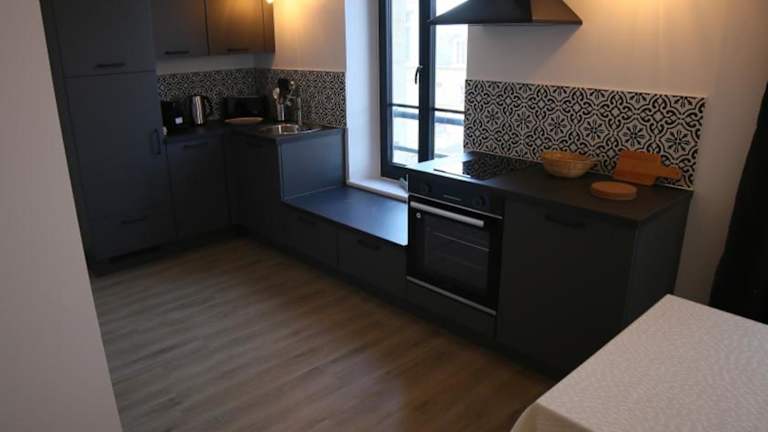 Die Unterkunft verfügt über eine gut ausgestattete Küche mit einem Kühlschrank, einem Geschirrspüler, einem Ofen und einer Kaffeemaschine.