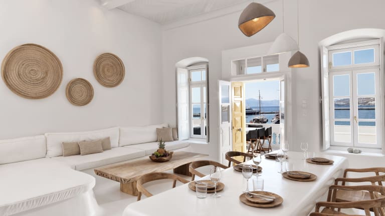 Die Unterkunft Villa Kampani Sea View Villa Mykonos Town bietet eine Gemeinschaftslounge und einen direkten Zugang zum Strand. Die Villa erstreckt sich über zwei Stockwerke und ist nur über Treppen erreichbar. Es besteht eine Autovermietung innerhalb der Unterkunft.