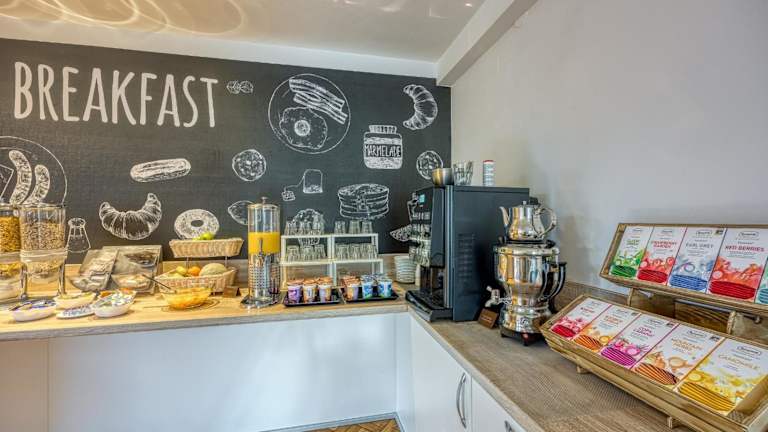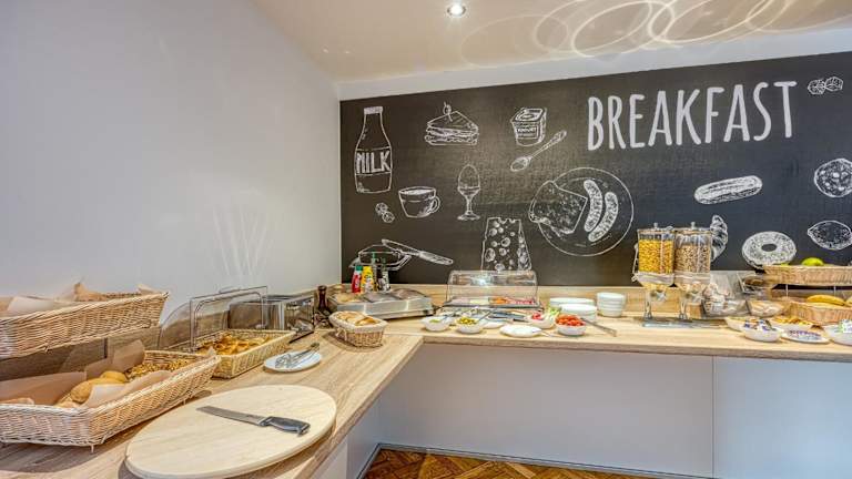 Das Frühstück wird in einem hellen Speisesaal mit grossen Fenstern serviert, der zusätzlich über eine kleine Terrasse vor dem Haus verfügt. Die Villa bietet auch einen schönen, grünen Garten zum Entspannen.