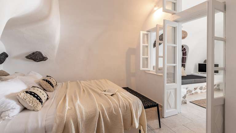 Die Zimmer und luxuriösen Suiten im Kykladenstil sind klimatisiert und bieten alles für einen angenehmen Aufenthalt. Sie sind mit gewölbten Decken, Betten aus Beton, einem Safe, Sat-TV und einem eigenen Badezimmer mit kostenfreien Pflegeprodukten ausgestattet. Für angenehmes Raumklima sorgt die Heizung, zudem sind Hosenpresser vorhanden. Zu den Zimmerkategorien gehören Familien- und Nichtraucherzimmer.
