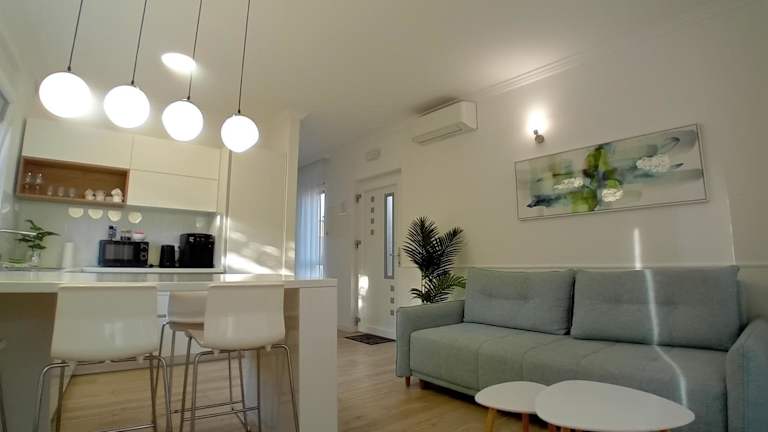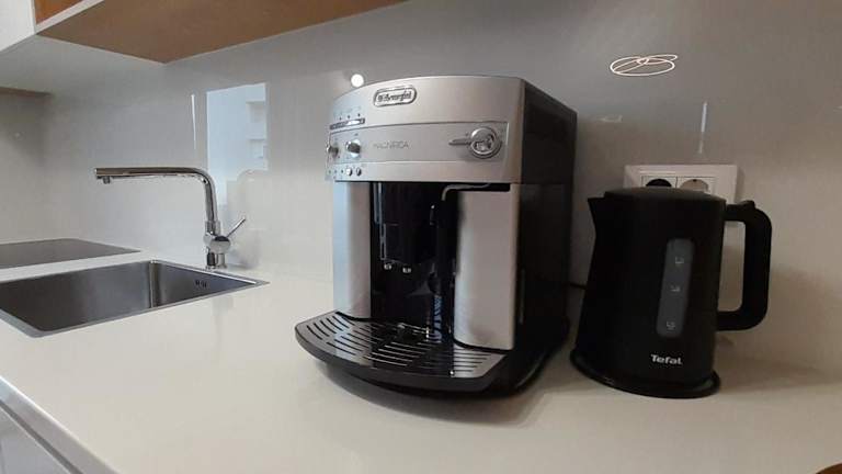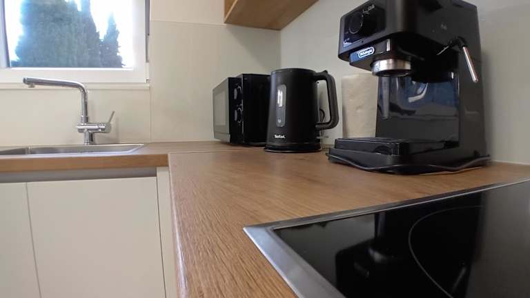 Die voll ausgestattete Küche in den Wohneinheiten umfasst einen Kühlschrank, Geschirrspüler, Mikrowelle, Herdplatte, Kaffeemaschine und Wasserkocher, was die Zubereitung von Mahlzeiten ermöglicht.