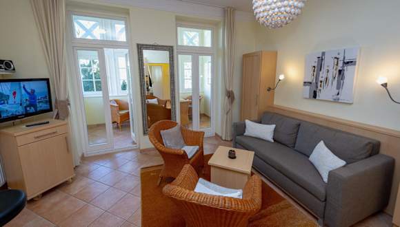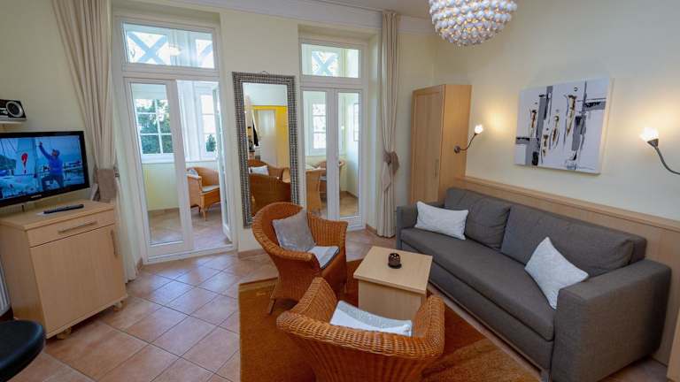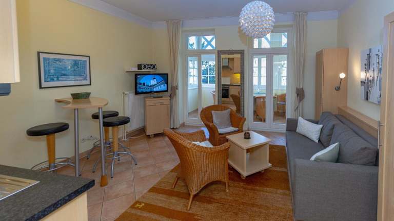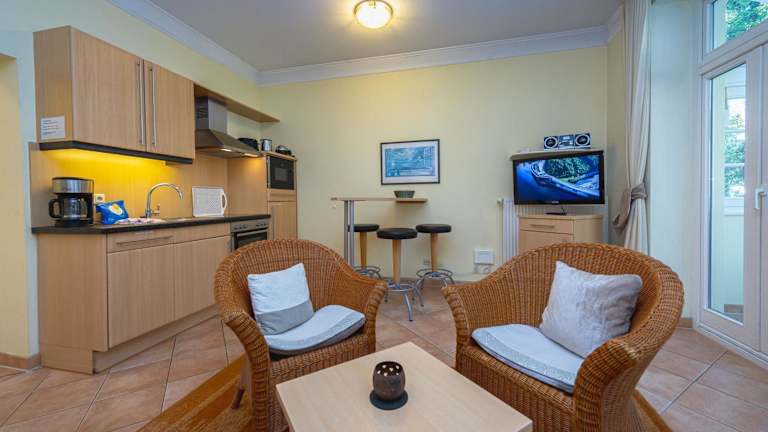 Die Wohnung verfügt über ein Schlafzimmer, ein Wohnzimmer sowie eine voll ausgestattete Küchenzeile mit Kühlschrank und Kaffeemaschine. Das Badezimmer ist mit einer Dusche und einem Haartrockner ausgestattet. Des Weiteren gibt es einen TV mit Satellitenkanälen. Bitte beachten Sie, dass Bettwäsche und Handtücher nicht im Preis enthalten sind und selbst mitgebracht oder gegen Aufpreis gebucht werden können.