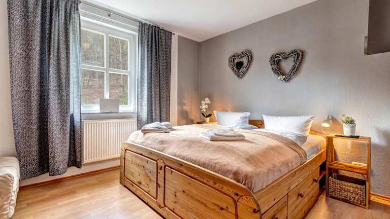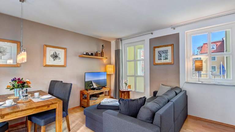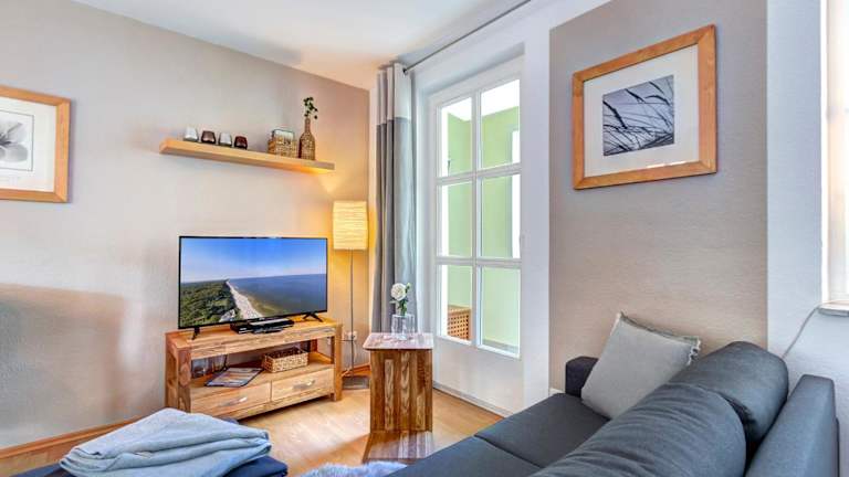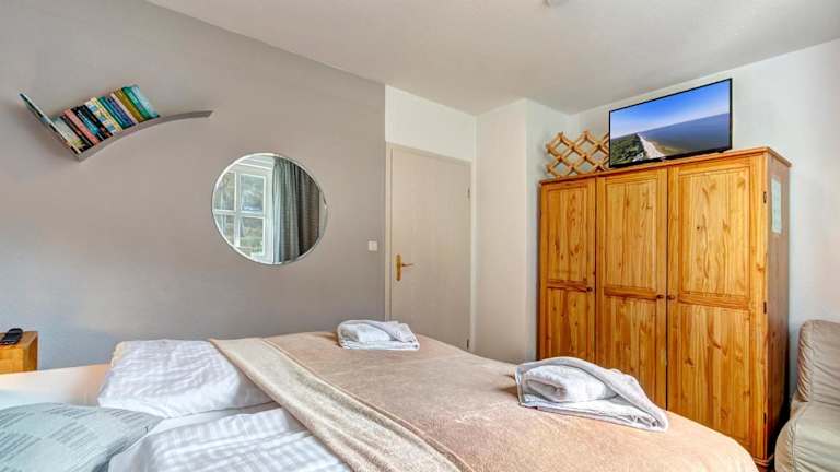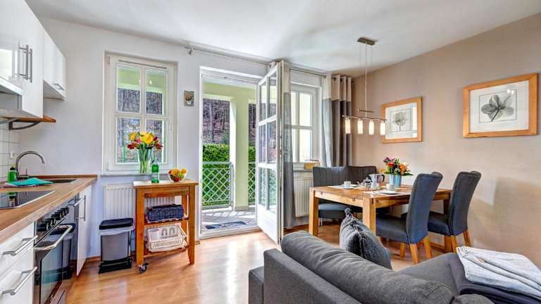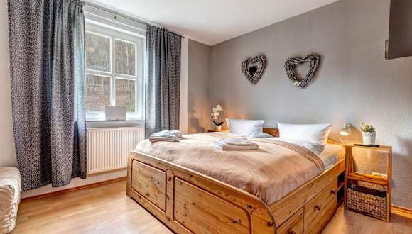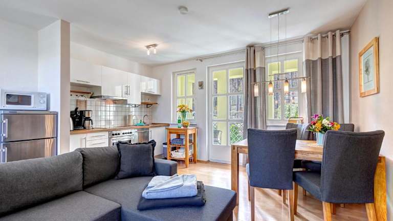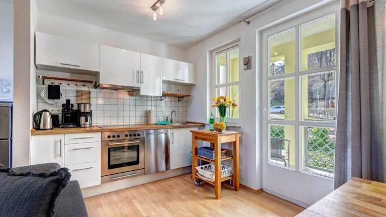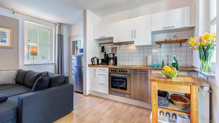 Die Ferienwohnung umfasst ein Schlafzimmer und ist mit einer Sitzgelegenheit, einem TV, einem Blu-ray-Player sowie einer voll ausgestatteten Küche, inklusive Kühlschrank, ausgestattet. Handtücher und Bettwäsche werden zur Verfügung gestellt.