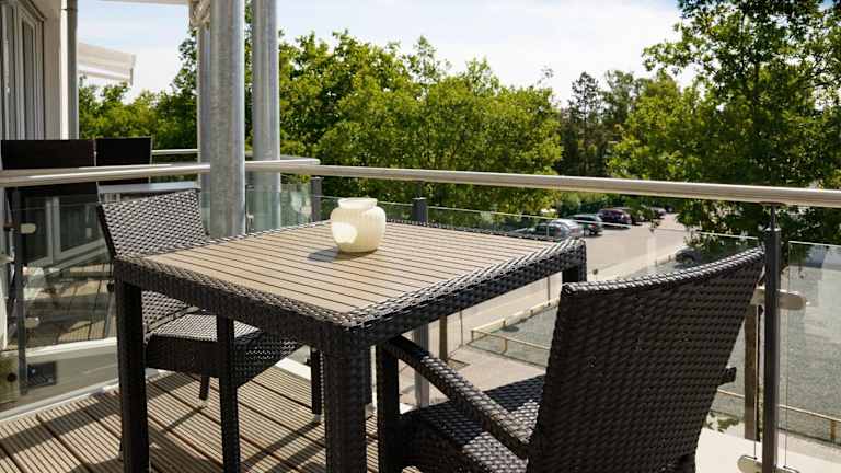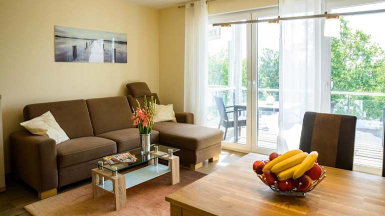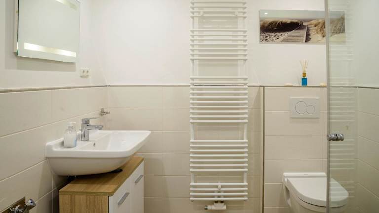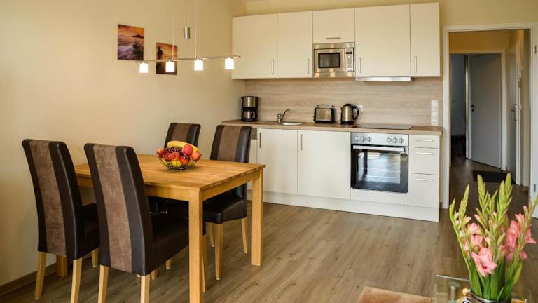 Die Ferienwohnung umfasst 1 Schlafzimmer und ein Badezimmer mit Dusche. Die Küchenzeile ist mit einem Kühlschrank und einem Geschirrspüler ausgestattet. Zusätzlich können Handtücher und Bettwäsche gegen Aufpreis bereitgestellt werden.