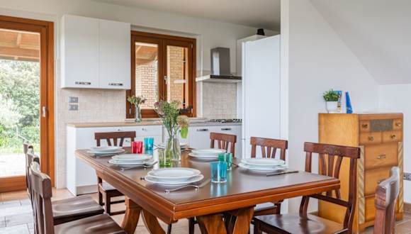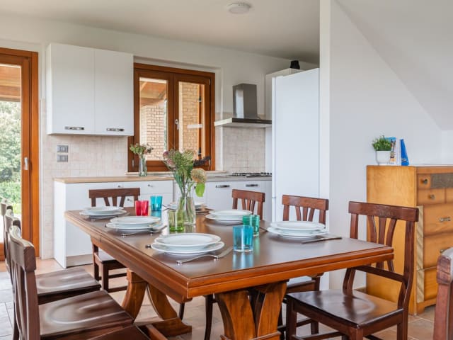 Die Villa verfügt über eine gut ausgestattete Küche mit Kühlschrank, Ofen, Herdplatte, Kaffeemaschine und Wasserkocher, was die Selbstverpflegung erleichtert. Weitere Verpflegungsmöglichkeiten sind nicht angegeben.