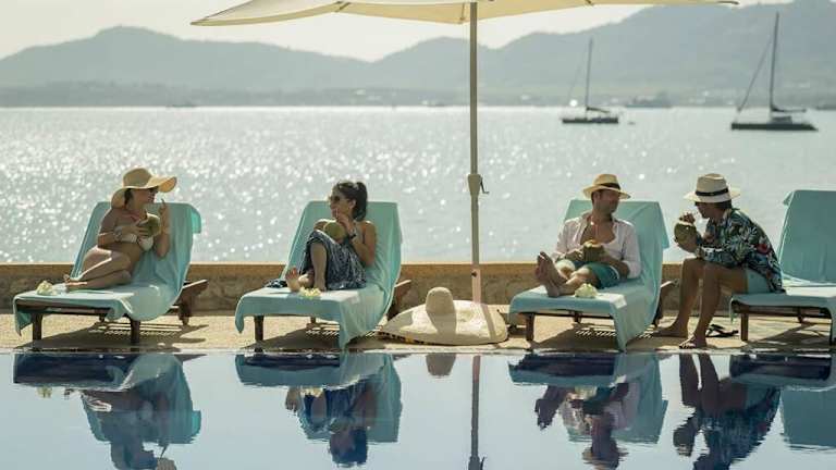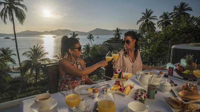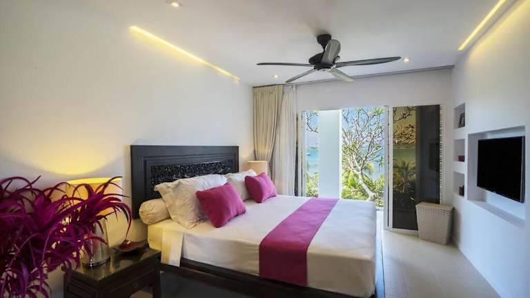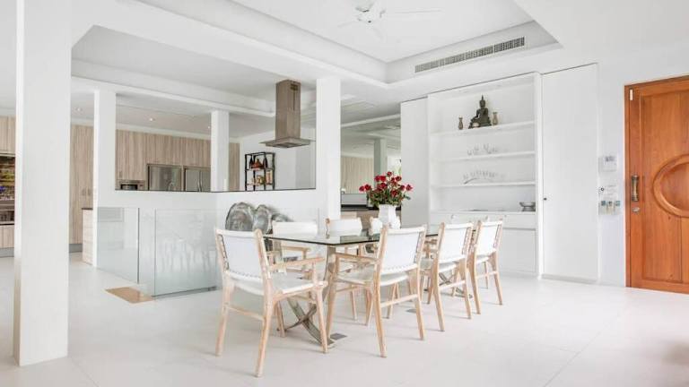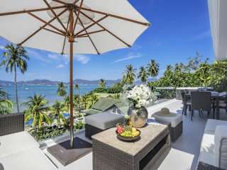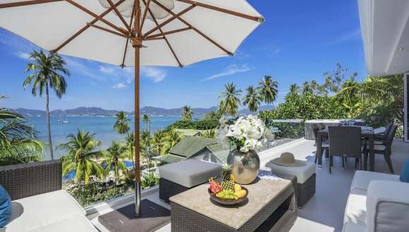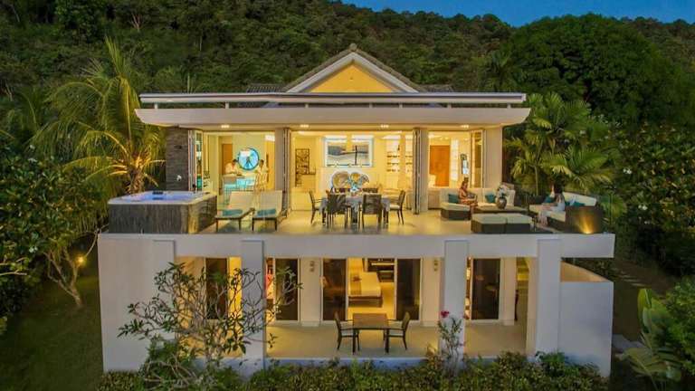 Die Unterkunft Villa Nirvana - Beachfront Tropical Chic 4BR Haven in Cape Panwa, Phuket bietet eine einladende Atmosphäre mit einem Garten, einer Terrasse und einer Bar. Die Villa ist klimatisiert und verfügt über eine Einladung zu erholsamen Ferien mit Meerblick. Eine Parkiermöglichkeit ist vorhanden, und ein Conciergeservice steht zur Verfügung, um den Aufenthalt zu erleichtern. Die Nutzung des Gemeinschaftspools mit den anderen neun Villen sorgt für eine angenehme Abwechslung.