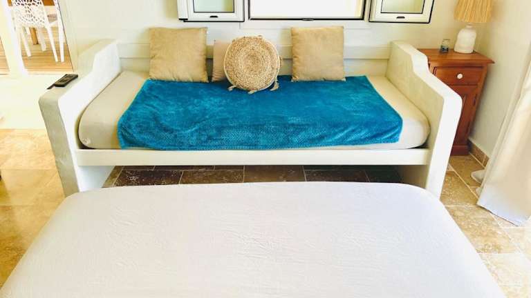 Die Villa ist klimatisiert und verfügt über 2 Schlafzimmer, ein Wohnzimmer sowie eine voll ausgestattete Küche mit Kühlschrank und Kaffeemaschine. Ein Badezimmer mit Whirlpool und Badewanne steht ebenfalls zur Verfügung. Handtücher und Bettwäsche werden bereitgestellt.