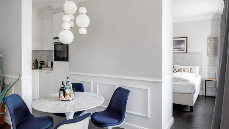 Die Ferienwohnung in der Villa Palazzo verfügt über 1 Schlafzimmer und eine gut ausgestattete Küche mit Kühlschrank und Geschirrspüler. Ein Flachbild-TV und ein gemütlicher Sitzbereich sind ebenfalls vorhanden. Das Badezimmer ist mit einer Dusche ausgestattet.